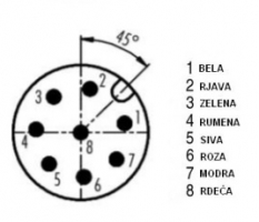 Prenesi PDF TOP izdelki ~ Konektor 8R 12 0 02 PUR/M OPL. MOŠKI Slika: Shema: Električna shema: Lastnost Vrednost Dimenzija M12 Stikalni tok [mA] 4000 mA Material ohišja PUR Dimenzija ohišja (L) 43,9 mm Mehanska zaščita IP 67 Priklop 2m PUR Temperatura območje delovanja - 25°C do + 85 °C LED funkcija NE Napetost 60 V Presek vodnika 0,25 mm2 Število pinov 8 Uporaba Za priklop naprav z M12 8 polnim ženskim vgradnim konektorjem in ostalih naprav z 8 polnih M12 priključkom. Oplet proti EMC motnjam (priklop opleta kabel na pin 8)