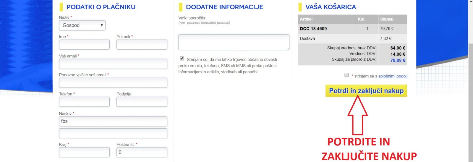 Po potrditvi nakupa prjemete potrditev naročila na vaš e-naslov z vsemi podatki za plačilo.
