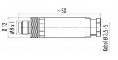 Prenesi PDF M8 konektorji brez kabla ~ Konektor 3R 08 0 00/M HS MOŠKI VIJAČNI HITROSPOJNI Slika: Shema: Električna shema: Lastnost Vrednost Dimenzija M8 Stikalni tok [mA] 4000 mA Material ohišja PBT/PA plastika Dimenzija ohišja (L) 50 mm Mehanska zaščita IP 67 Priklop M8 moški Temperatura območje delovanja - 40°C do + 85 °C LED funkcija NE Napetost 60 V Presek vodnika 0,08 - 0,25mm² Število pinov 3 Spajanje vodnikov prebodni način Uvodnica za kabel 2,5 - 5 mm Zaloga je omejena na 15 kosov Uporaba Za priklop na kabelska induktivna stikala, optične senzorje, konektorske razdelilnike spajanje vodnikov v kombinaciji nasprotnim konektorjem. Vijačni način spajanja zagotavlja kvalitetno povezavo med konektorjem in žico na terenu. Enostavno snamete zunanjo izolacijo vstavite izolirane žice v konektor in zavrtite. Mehanizem prebode izolacijo in ustvari stik.