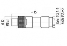 Prenesi PDF M8 konektorji brez kabla ~ Konektor 4R 08 0 00/M VIJAČNI Ravni Slika: Shema: Električna shema: Lastnost Vrednost Dimenzija M8 Stikalni tok [mA] 4000 mA Dimenzija ohišja (L) 45 mm Mehanska zaščita IP 67 Temperatura območje delovanja - 40°C do + 85 °C LED funkcija NE Napetost 30 V Presek vodnika 0,25 mm2 Število pinov 4 Spajanje vodnikov Vijačno Uvodnica za kabel 3,5 - 5 mm Uporaba Za hiter priklop na terenu, enostavni vijačni način spajanja vodnikov.