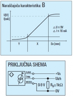 Prenesi PDF Induktivni senzor ~ Analogni, konektorski DCAL18 5619 UK ANALOGNA NARAŠČAJOČE 1-9V Slika: Shema: Električna shema: Lastnost Vrednost Dimenzija M 18 Način vgradnje stikala Neporavnan Preklopna razdalja Sn [mm] 3 - 8 Napajalna napetost DC Napajalna napetost U[V] 15-30 V DC Valovistost napetosti Ud 0.8 Lastna raba Io[mA] >20mA Material ohišja Nerjavno jeklo 1.4301 Oblika ohišja valjasta Dimenzija ohišja (L) 70 mm Mehanska zaščita IP 67 Priklop 2m PVC Temperatura območje delovanja 0 °C do + 60 °C Temperaturno odstopanje 0.8 Zaščita zamenjave polov Vgrajena Neuporabna cona 3mm