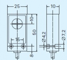 Prenesi PDF TOP izdelki ~ Kabelsko DCE 25 5809 - 10mm PNP NO Slika: Shema: Električna shema: Lastnost Vrednost Dimenzija Kvader 25 Način vgradnje stikala Neporavnan Preklopna razdalja Sn [mm] 10 Posebna preklopna razdalja 10 mm Napajalna napetost DC Napajalna napetost U[V] 10-30 V DC Padec napetosti U[Ud] 1,5 V Valovistost napetosti Ud < 10% Lastna raba Io[mA] 10 mA Maksimalni tok I[mA] 250mA Material ohišja Plastika Oblika ohišja Kvader Dimenzija ohišja (L) 25x50x10 mm Mehanska zaščita IP 67 Priklop 0,14m žice Temperatura območje delovanja -25 °C do + 70 °C Ponovitvena točnost R < 2% Sn Histereza Hy 1% - 15% Frekvenca preklopa [f] 500 Hz Zaščita zamenjave polov Vgrajena LED funkcija DA