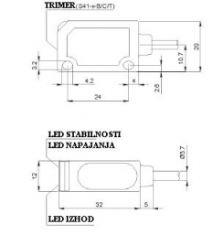 Prenesi PDF Optični senzorji razno ~ Zrcalna zapora – polarizacijska prozorna S41-2-T-P PNP PNP, NO+NC Slika: Shema: Električna shema: Lastnost Vrednost Dimenzija 37 X 20 X 12 mm Preklopna razdalja Sn [mm] 100 - 700 Napajalna napetost DC Napajalna napetost U[V] 10-30 V DC Padec napetosti U[Ud] 1,5 V Lastna raba Io[mA] 30 mA Maksimalni tok I[mA] 100 mA Material ohišja ABS plastika Oblika ohišja Kvader Dimenzija ohišja (L) 37 mm Mehanska zaščita IP 66 Priklop 2m PVC Temperatura območje delovanja - 25°C do + 55 °C Frekvenca preklopa [f] 500 Hz Zaščita zamenjave polov Vgrajena LED funkcija DA Izvedba optike RAVNA Način delovanja temno/svetlo-prevodni Svetloba oddajnika rdeča 660 nm Nastavitev razdalje DA Odzivni čas 1 ms